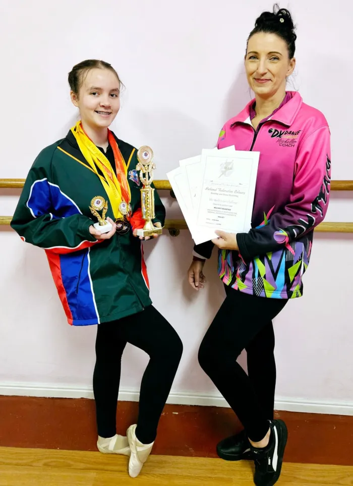 Meloney Branford, 15, is congratulated by DX Dance’s Michelle Wright for receiving her regional and national colours in modern dance, contemporary and ballet. She also achieved the highest score in all dance categories at the International Fine Arts Association Dance Awards Competition 2024 on Saturday June 1. Picture: Supplied