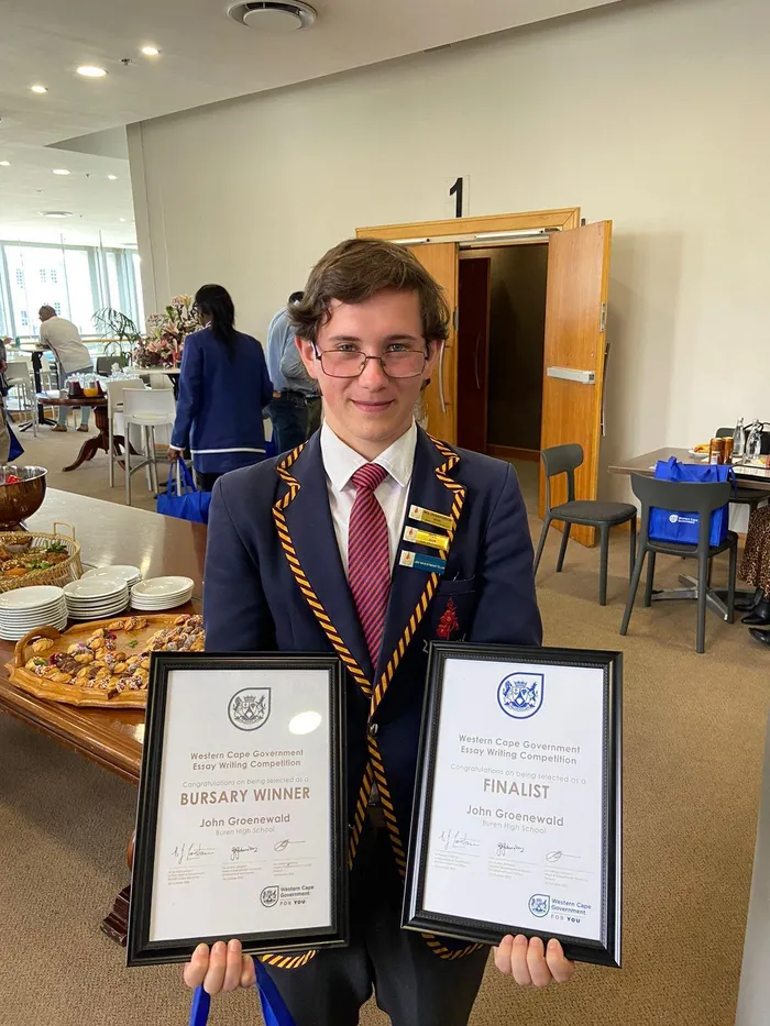 Buren High School Grade 12 pupil John Groenewald clinched top honours in the Western Cape Education Department’s Economics Essay Writing Competition. John’s work earned him R3 000 in prize money as well as a bursary from the department.