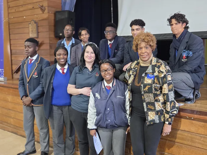 Milnerton High School came in at fourth position; from left, seated at the back are Hannah Mashazi; Annabella Gizi; and Favour Mensah. In front are, Teacher Mrs A Snyman; Uyabulela Dingayo; Pierre de Wet; and Dr Bettye Walker