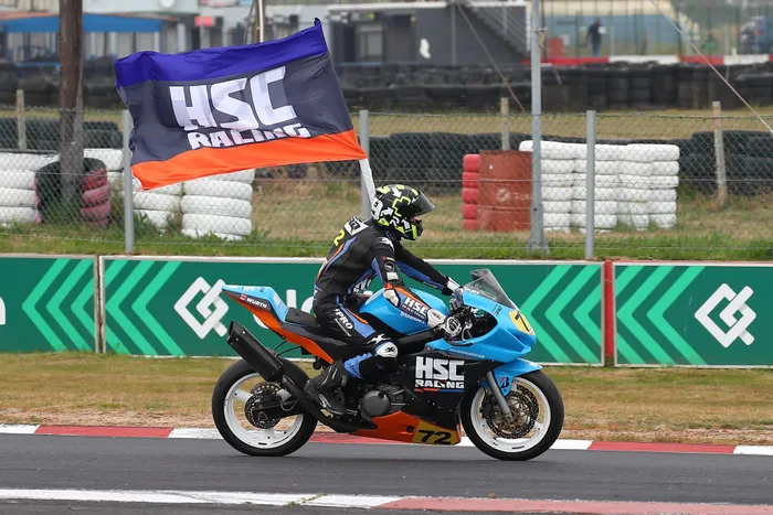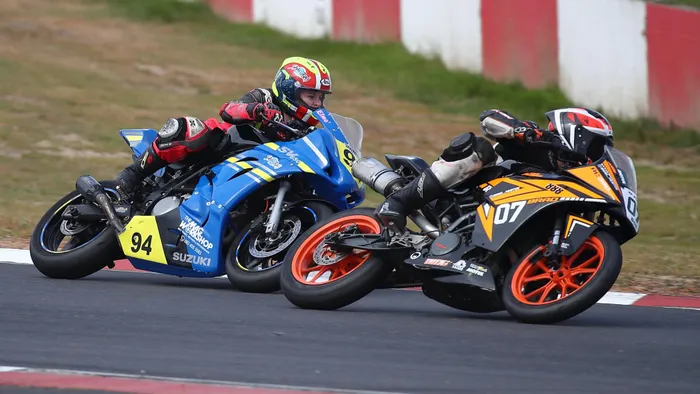 Elme Mostert on her Suzuki (94) hot on the heels of young Bradley Mostert [kduring the powersport bike race, at Killarney, on Saturday.