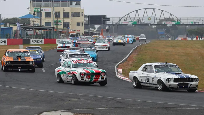 Michael Hitchcock (Ford Mustang), Franco Donadio [Ford Escort] and Boetie van Zyl [Ford Fairmont GT) come roaring into Hoals Hoek in the opening lap of Saturday's classic car race, at Killarney.