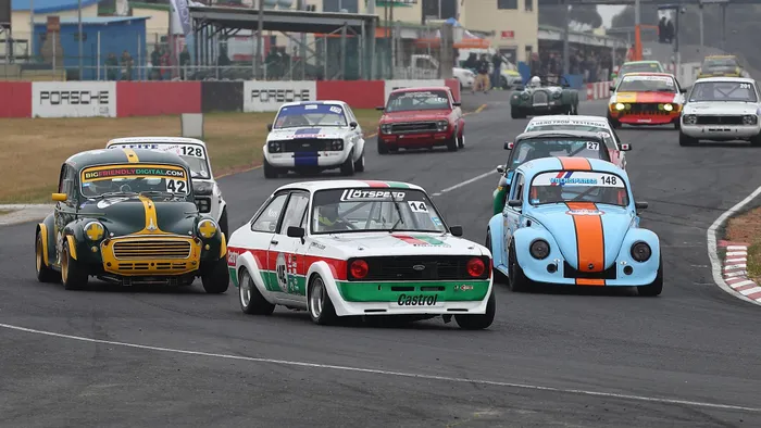 Daniel Lotter, flanked by a Morris Minor and a Volkswagen beetle, heads up the smaller classes of the classic car racers, at Killarney, on Saturday.