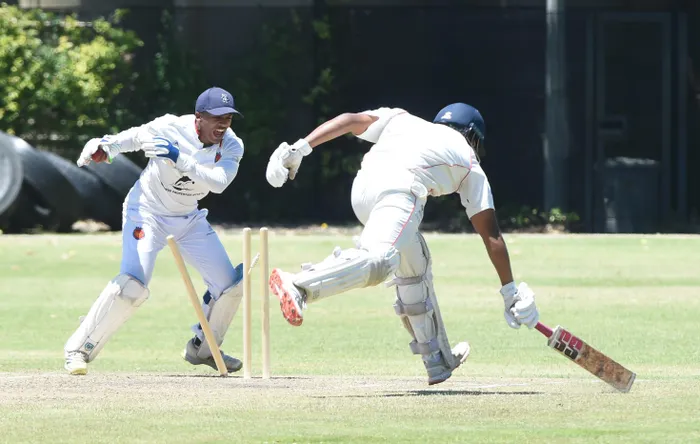 Gennaro Reddy of Victoria is run- out by Rondebosch’s wicketkeeper Michael Appolis during their Western Province Cricket Association Premier League match at the Terry Eksteen Oval, on Saturday.