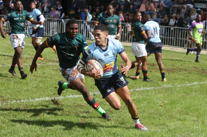 Milnerton fullback Chadlin Sellidon on the way to score a try against Glenwood.