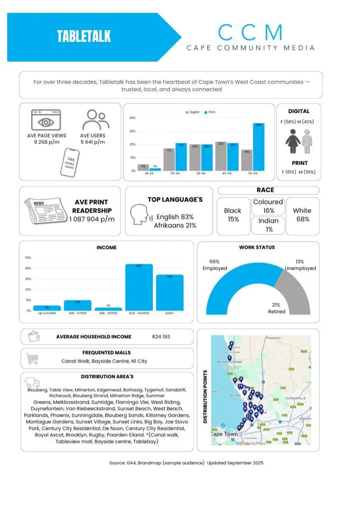 The Tabltalk is a free weekly community newspaper available in print and digital format, and is distributed to 67 673 readers’ homes every Wednesday in the Blouberg, Table View, Milnerton, Edgemead, Bothasig, Tygerhof, Sanddrift, Richwood, Blouberg Strand, Milnerton Ridge, Summer Greens, Melkbosstrand, Sunridge, Flamingo Vlei, West Riding, Duynefontein, Van Riebeeckstrand, Sunset Beach, West Beach, Parklands, Phoenix, Sunningdale, Blouberg Sands, Killarney Gardens, Montague Gardens, Sunset Village, Sunset Links, Big Bay, Joe Slovo Park, Century City Residential, Dunoon, Royal Ascot, Brooklyn, Rugby and Paarden Eiland areas.